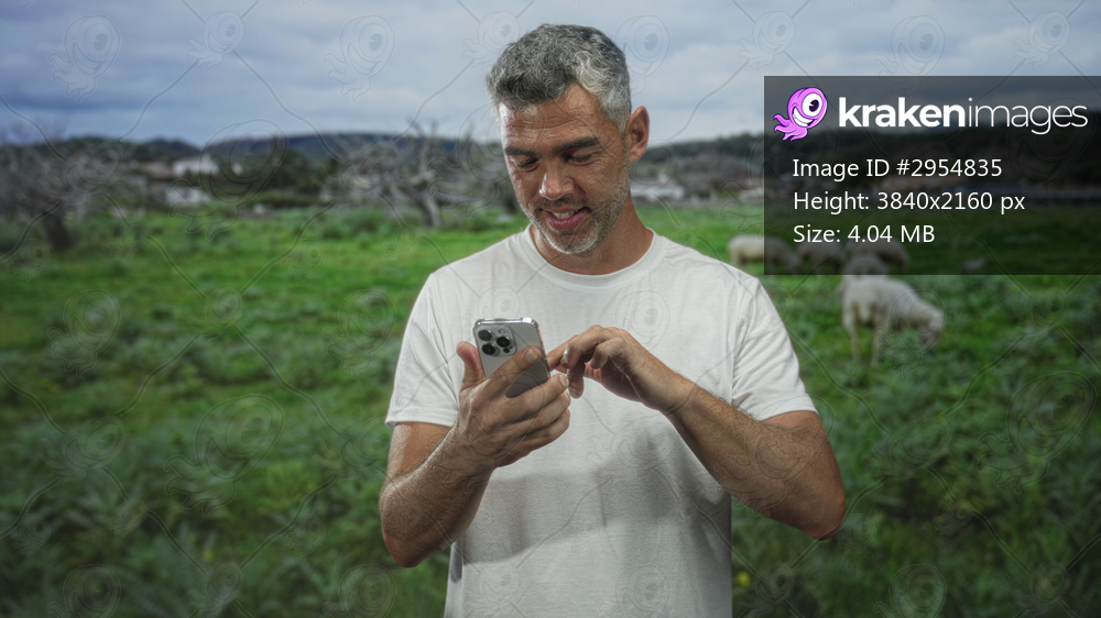Man with grey hair tapping smartphone with both hands in forest near grazing sheep and distant houses; digital connection concentration.