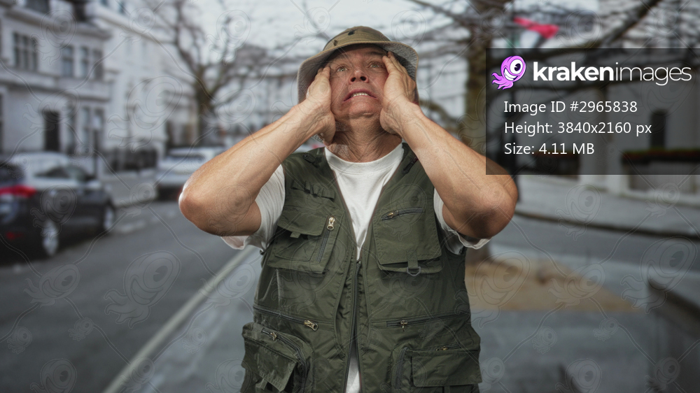 Man with grey hair wearing a bucket hat, white t shirt and fishing vest presses hands to temples and grimaces on a residential street; frustration solitude. - Kraken Images