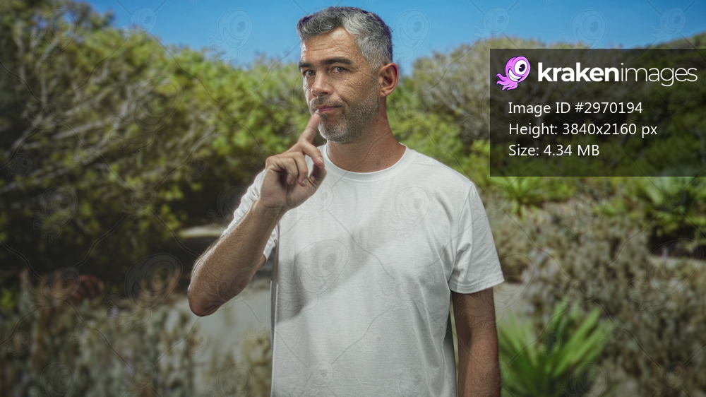 Man with grey hair wearing white tshirt points finger to lips for silence in forest; calm contemplation.
