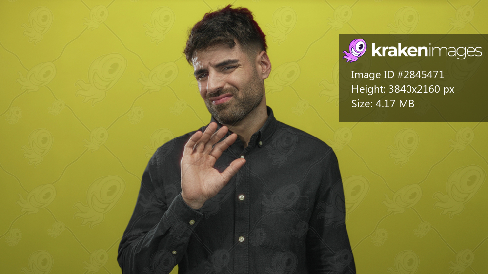 Man grimaces with furrowed eyebrows and squinted eyes, showing a tense face in a yellow studio portrait; disgust.