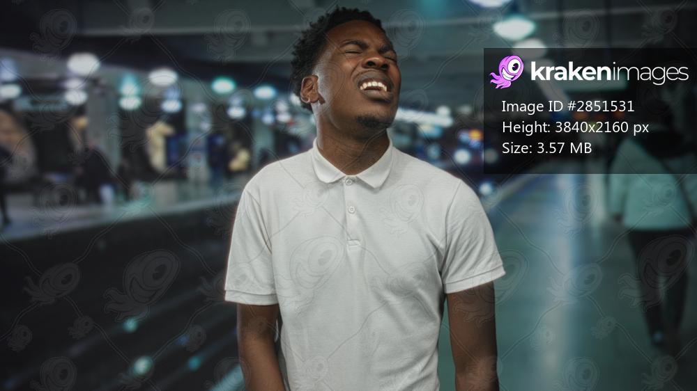 Man grimaces on empty train station platform wearing white polo shirt; frustration delay commute hurry.