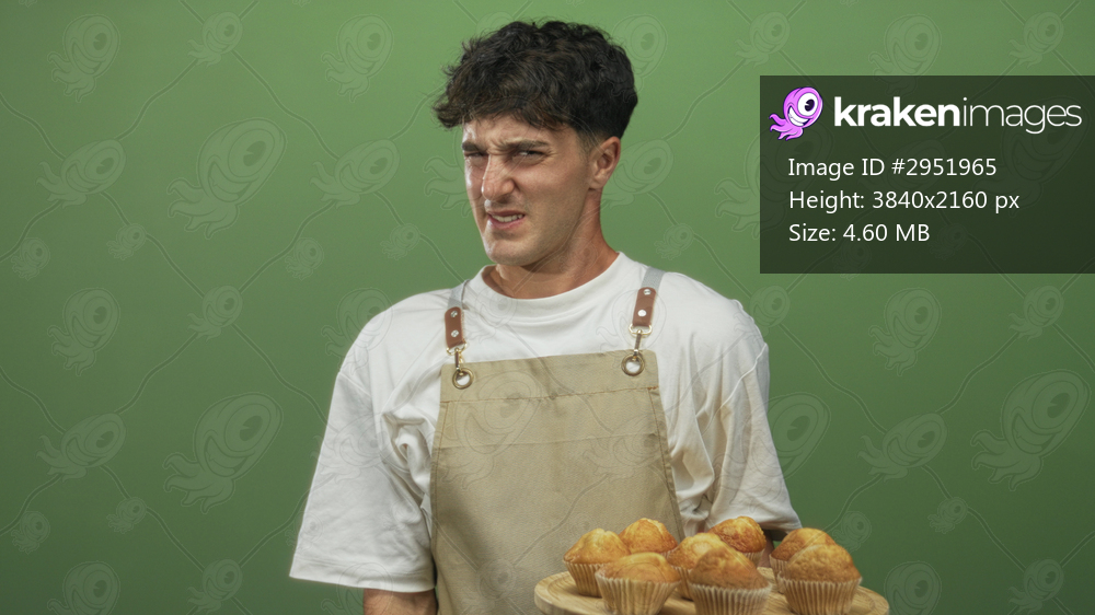 Man grimaces while holding a tray of muffins in a studio with green walls, wearing beige apron and white tee; disgust doubt unease.