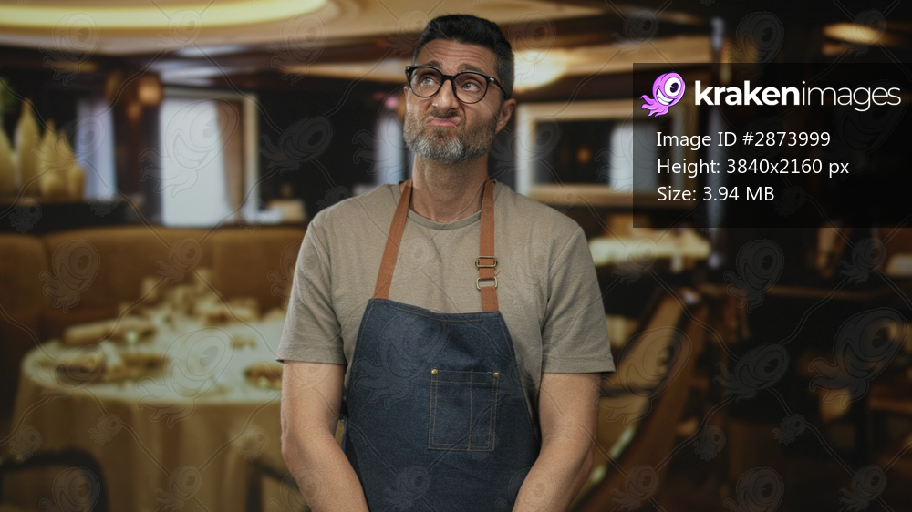 Man grimaces while wearing denim apron and glasses in a restaurant building dining room with set table behind him; resignation fatigue.