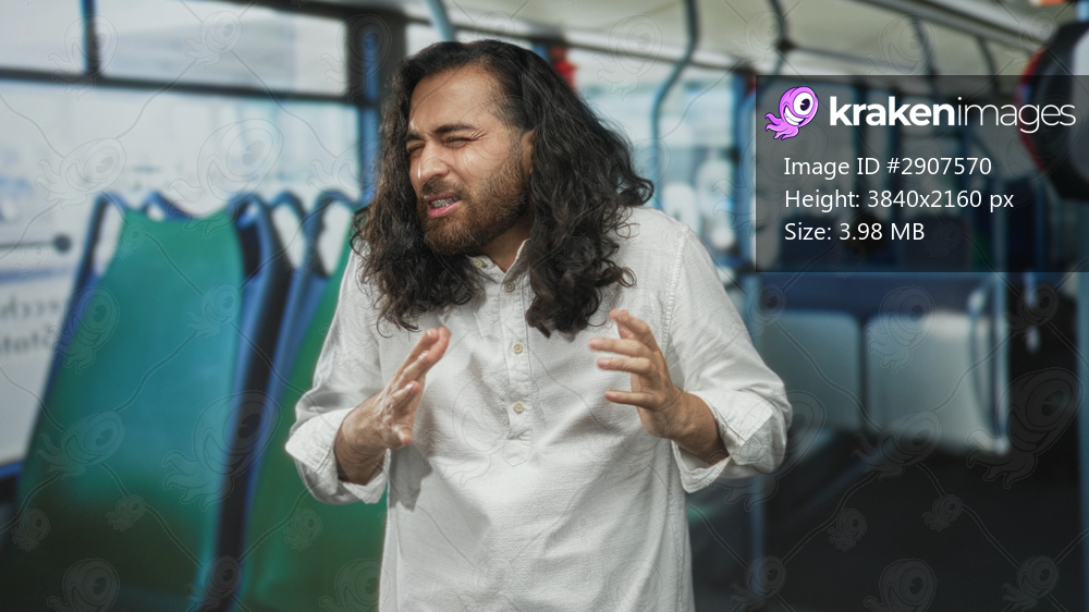Man grimacing and gesturing with hands near chest on a crowded bus street, standing by green passenger seats and windows; discomfort travel stress.