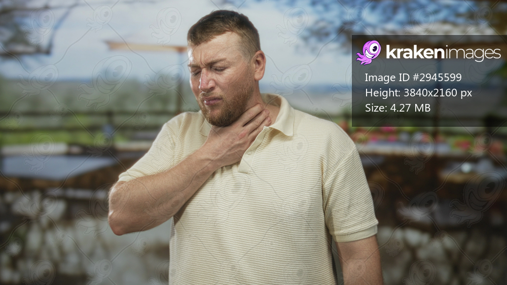 Man grimacing holding throat with hand on neck at restaurant terrace outdoors; sore throat discomfort.
