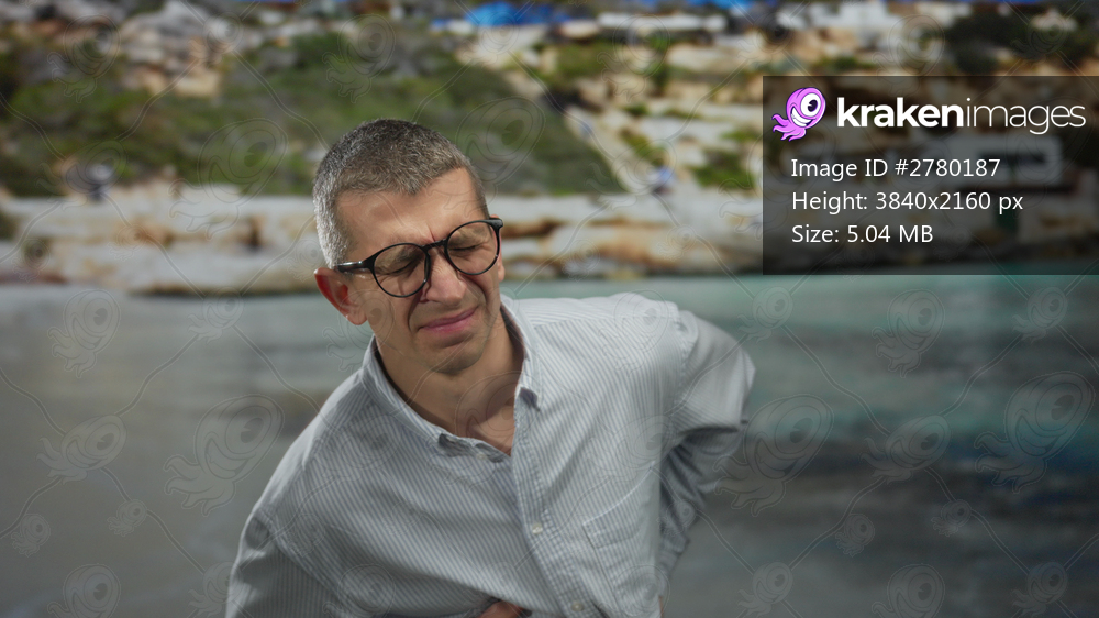 Man grimacing in discomfort near seaside, wearing glasses and striped shirt, standing on beach with rocky background and calm sea under overcast sky.