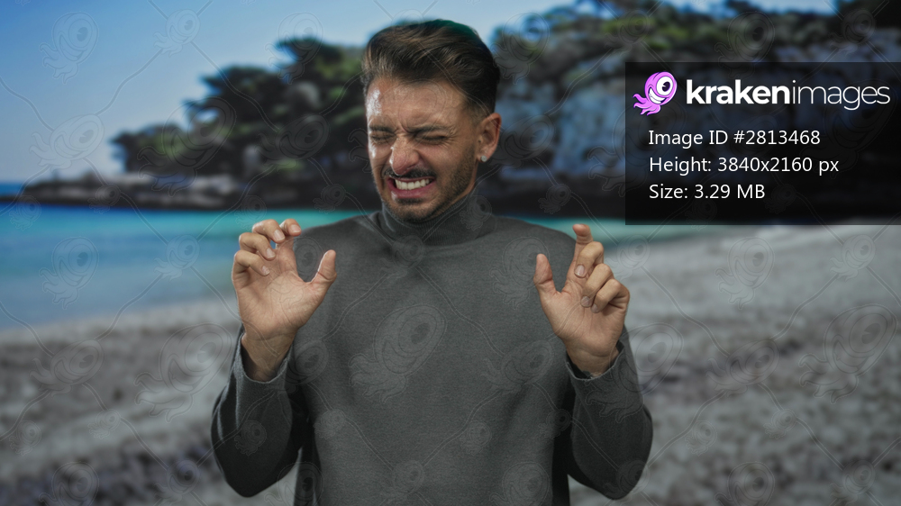 Man grimacing and pointing index fingers on sandy beach near rocky seaside cliffs under bright sun; frustration.