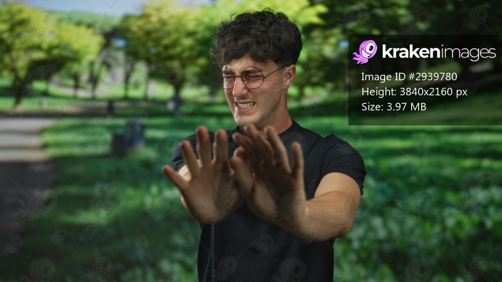Man grimacing with squinted eyes and round glasses on a sunlit green park path among trees and grass; disgust unease.
