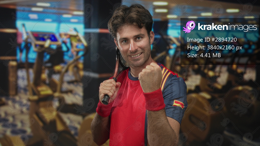 Man gripping tennis racket over shoulder and pumping clenched fist in gymnasium with treadmills and exercise bikes nearby; victory determination.