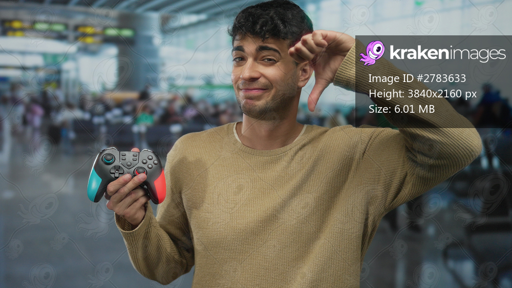 Man grips controller and shows dislike in airport as young hispanic guy lifts gamepad at terminal while gaming.