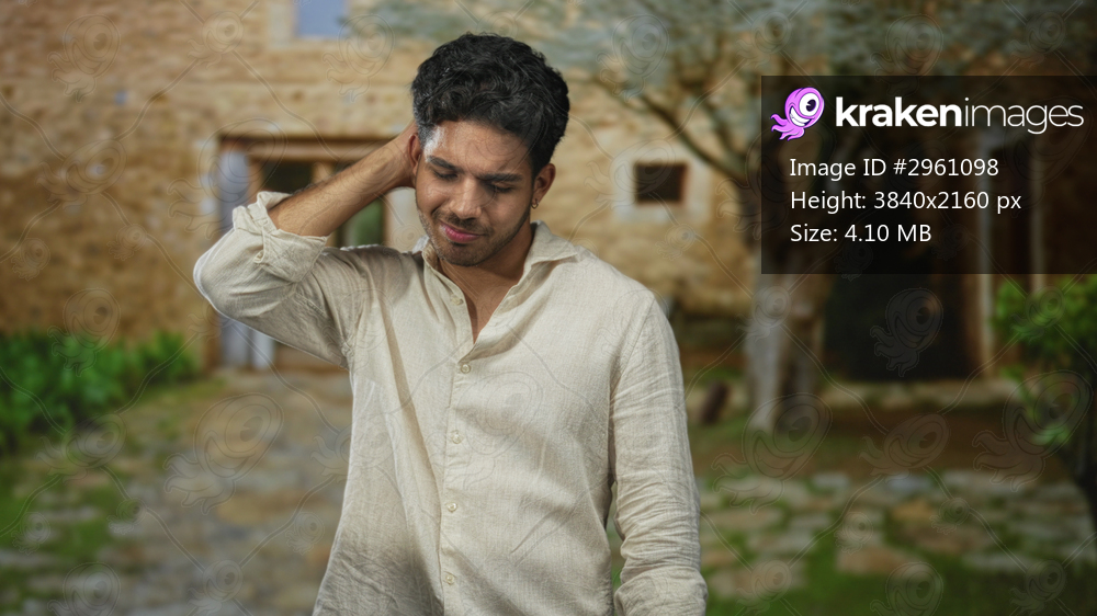 Man with hand behind head touching his neck in a courtyard building wearing a linen shirt; thoughtful reflection.