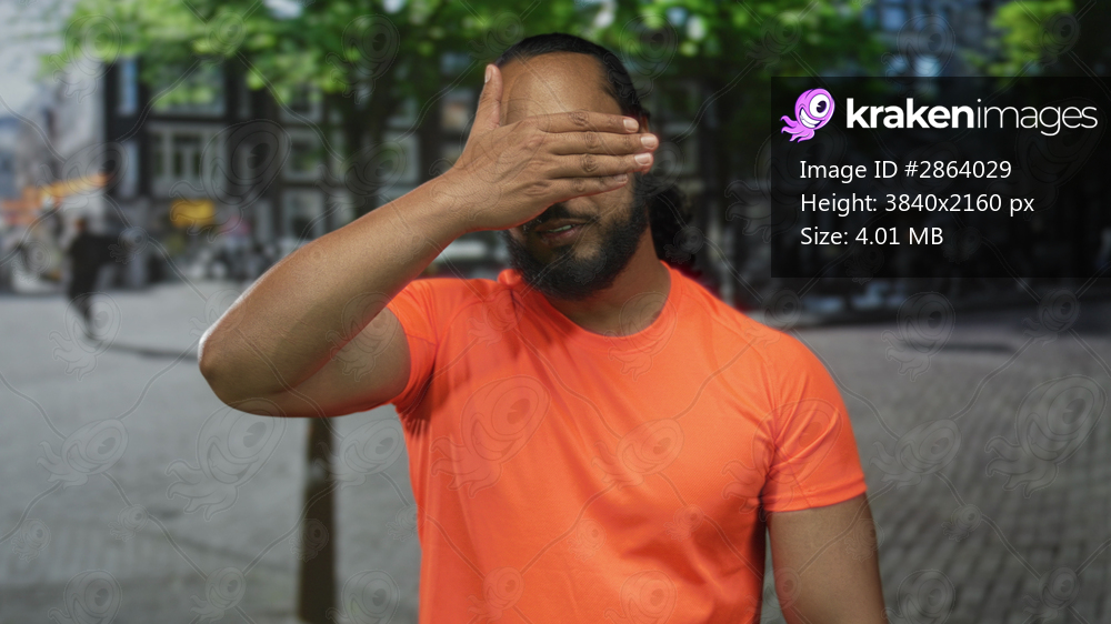 Man with hand covering eyes on a cobbled street wearing bright orange shirt and smiling broadly; playful.