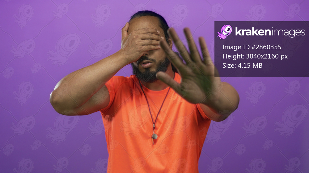 Man with hand covering eyes and palm out stop gesture in purple studio wearing orange shirt and whistle pendant; anxiety.