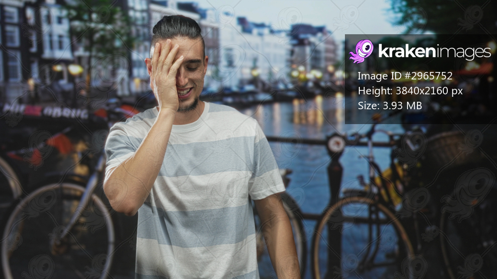 Man with hand covering face in facepalm in a studio with a canal street backdrop and parked bicycles; embarrassment transition.