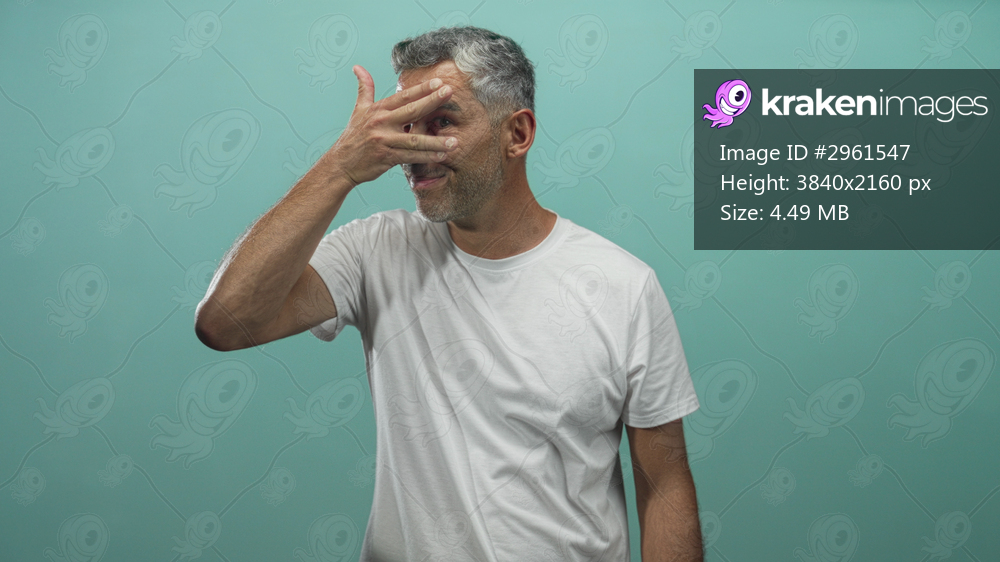 Man with hand covering face in studio wearing white tshirt, peeking through fingers; shyness introspection.
