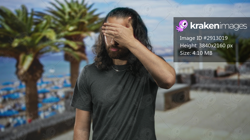 Man with hand covering face on beach street promenade near palm trees and benches; embarrassment introspection.