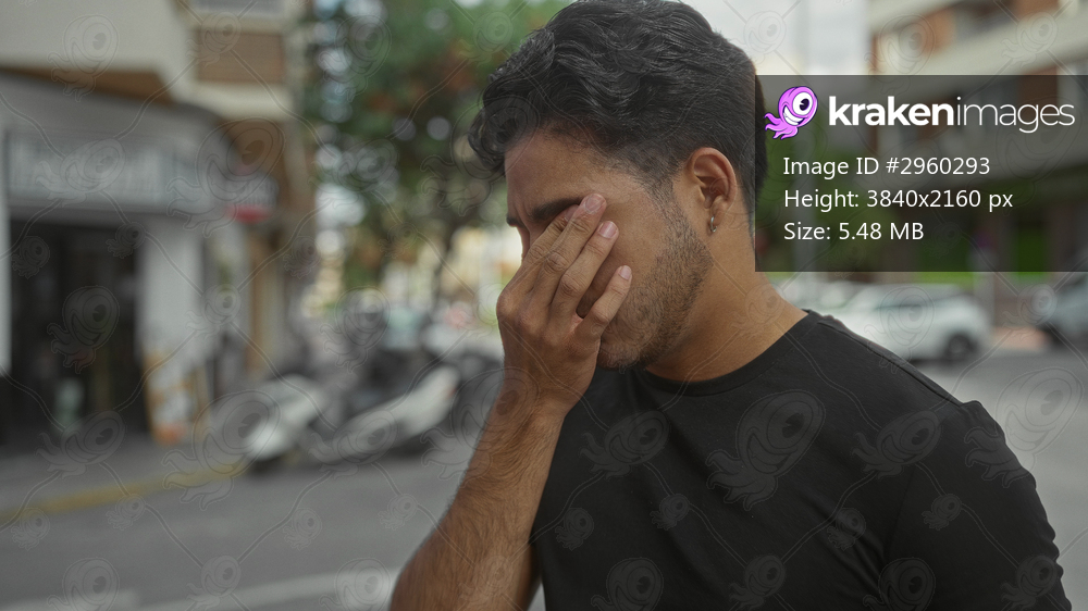 Man with hand covering face and visible fingers over eyes on street near parked scooters and multistory building; stress reflection.