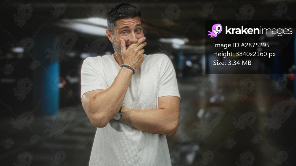 Man with hand covering mouth and crossed arm, forearm visible, wearing white shirt beside parked cars in parking building; embarrassment.