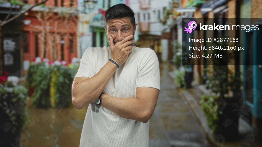 Man with hand covering mouth and crossed arms wearing white shirt standing in narrow street alley with potted plants and brick building facades; embarrassment. - Kraken Images