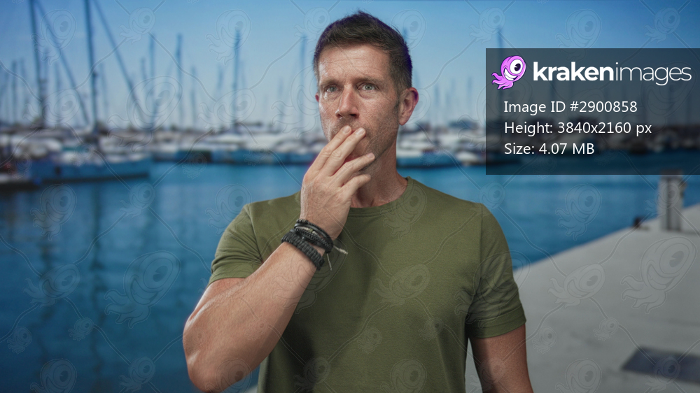 Man with hand covering mouth for silence at street dock by boats and marina, wearing olive t shirt and leather bracelet, looking sideways with reserved expression; surprise. - Kraken Images