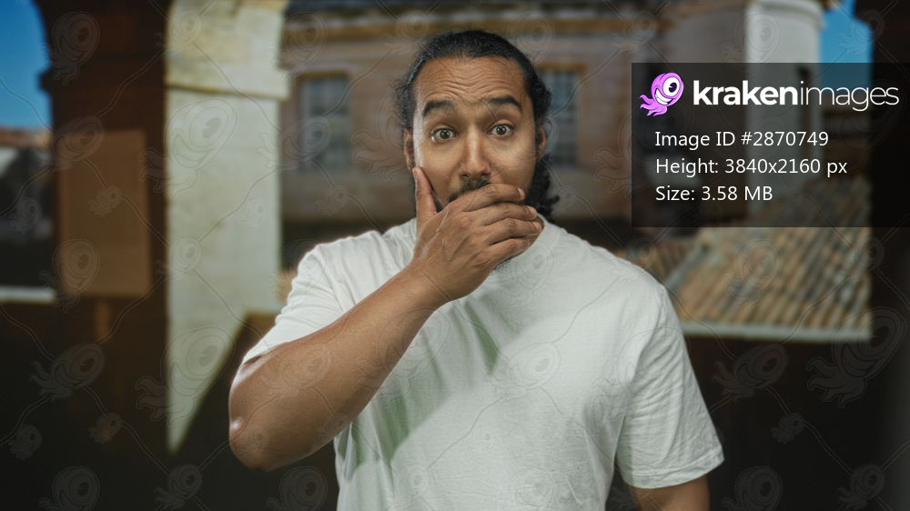 Man with hand covering mouth in old town building near tiled roof wearing plain white t shirt, steady gaze; surprise secrecy introspection.