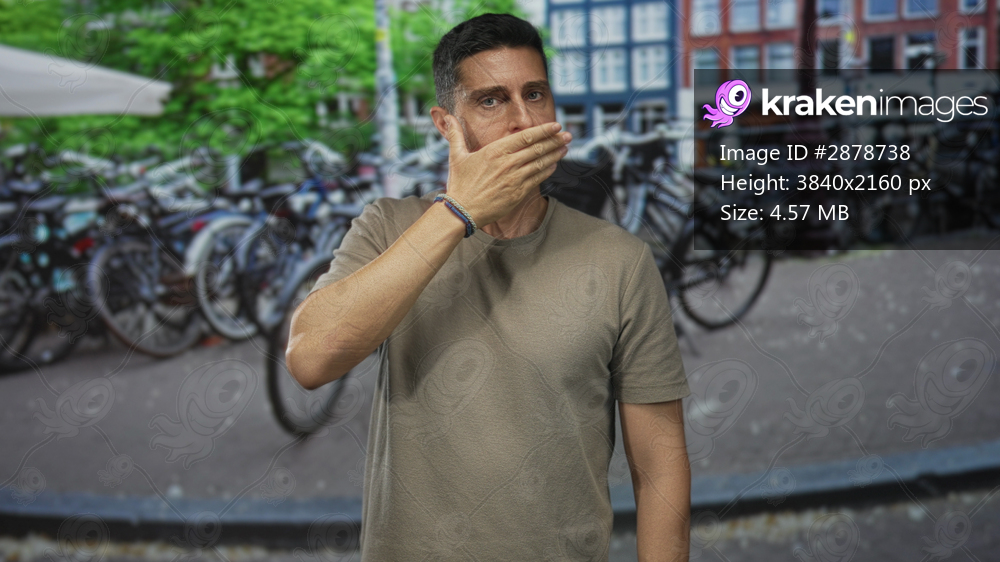 Man with hand covering mouth on street near parked bicycles and brick building, wearing beige t shirt and bracelet, standing upright; silence.