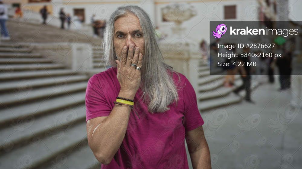 Man with hand covering mouth on street steps near stone staircase, long gray hair and beard, wearing magenta shirt; quiet reflection weariness.