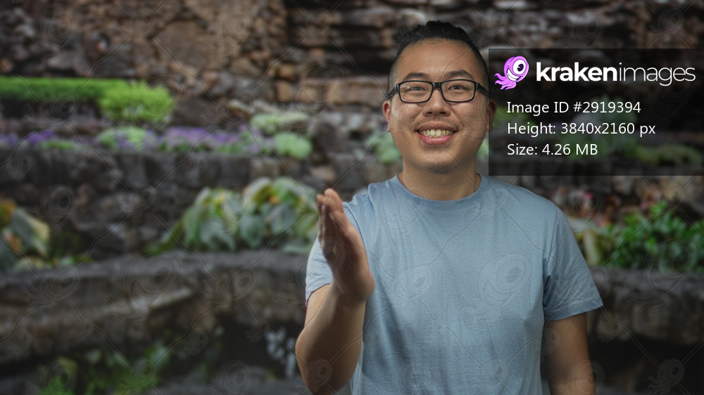 Man with hand covering mouth and outstretched hand in forest wearing glasses and blue shirt outdoors park scene; friendly greeting.