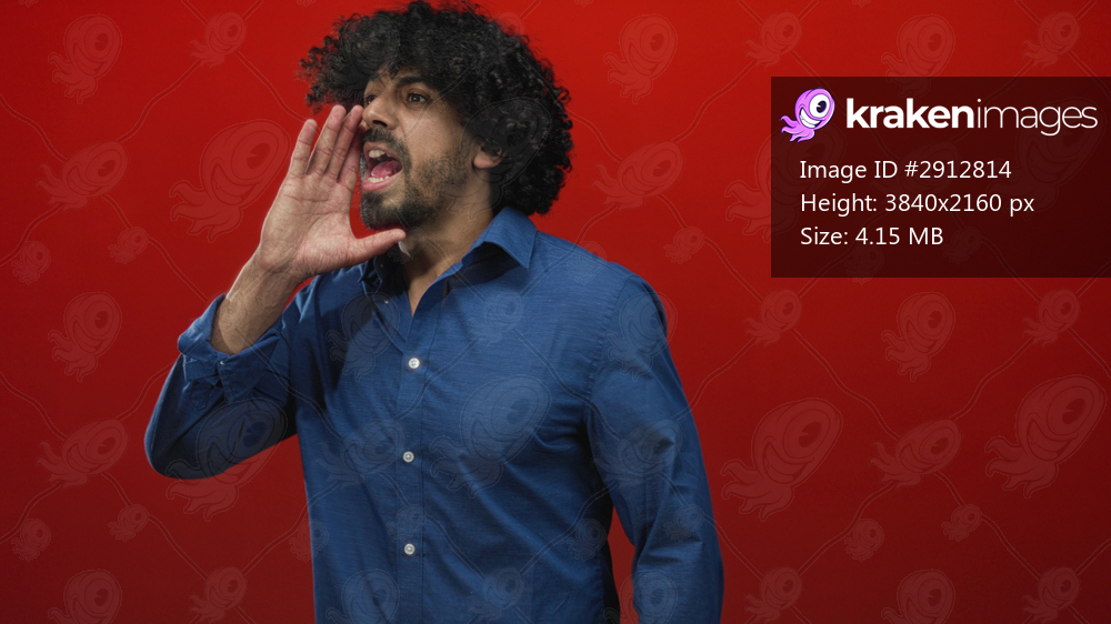 Man with hand cupped to mouth calling toward the right in a red studio, blue shirt, curly hair and beard; urgency communication.