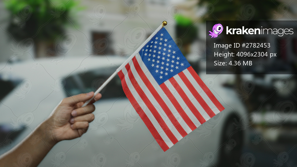 Man hand holding american flag in city street scene with cars and trees reflecting patriotism and national pride in the united states outdoors.