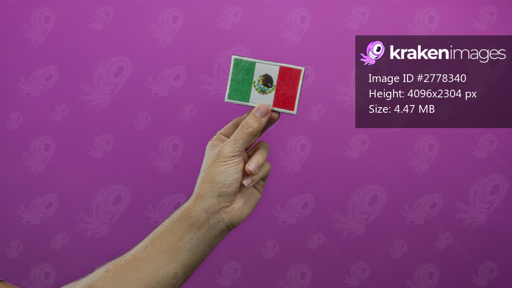 Man hand holding mexican flag embroidery against a vibrant pink wall, showcasing national pride and craft on an isolated colored background with emphasis on cultural textiles. - Kraken Images