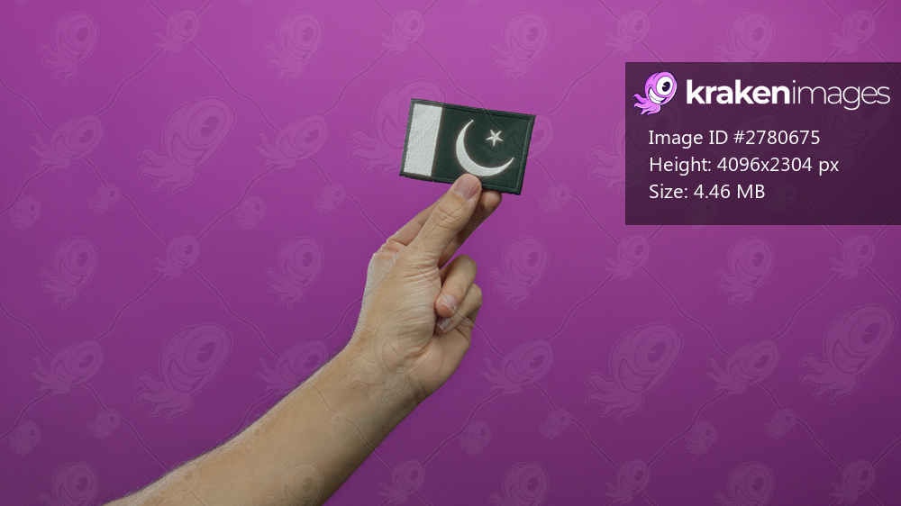 Man hand holding pakistan flag embroidery on pink background representing national pride and identity with a clear isolated setting for cultural significance and design. - Kraken Images