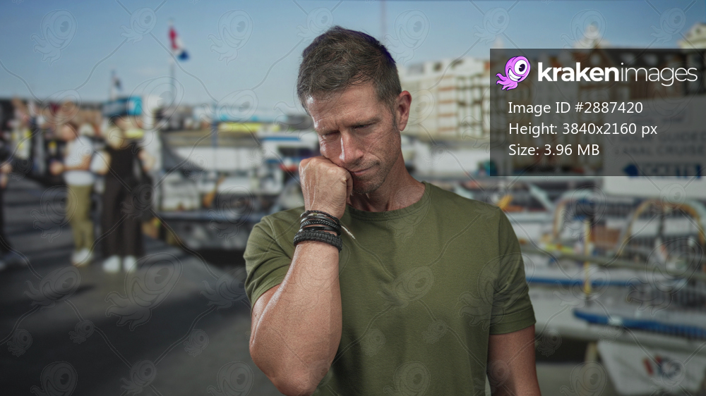 Man with hand on cheek and braided bracelets standing by boats on a street pier in olive t shirt and shorts, waterfront buildings behind him; quiet contemplation. - Kraken Images