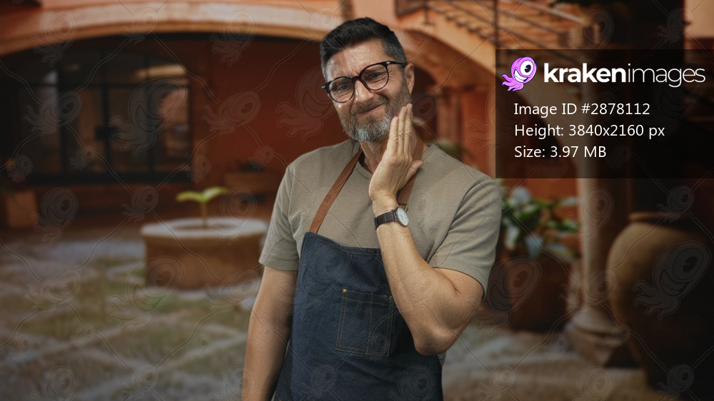 Man with hand on cheek for toothache in a building entrance wearing apron and glasses; toothache pain.