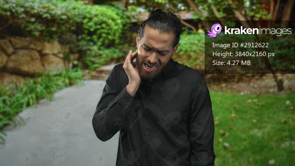 Man with hand on cheek for toothache in park pathway near stone wall, wearing black shirt and grimacing while leaning forward; pain concern.