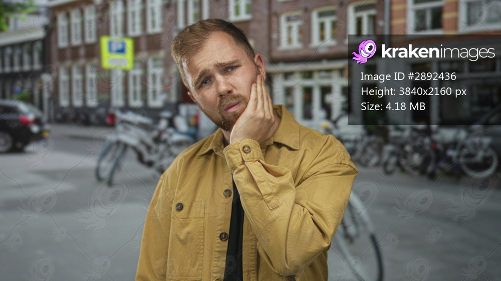 Man with hand on cheek for toothache on city street by parked bicycles and brick buildings; toothache pain.