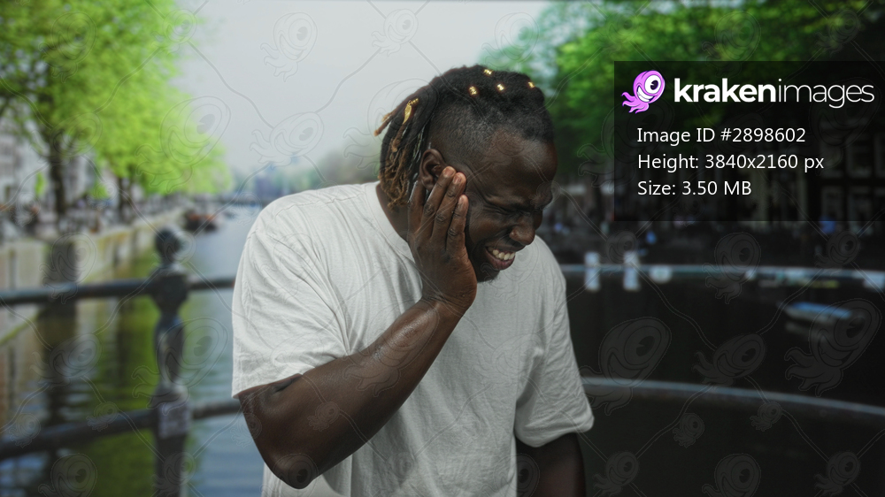Man with hand on cheek for toothache on street canal bridge wearing white shirt and teeth clenched; pain struggle.