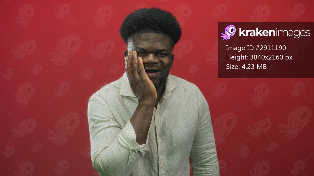 Man with hand on cheek in studio by red wall wearing light shirt, pressing face in clear pained expression; toothache pain.