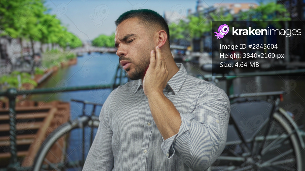 Man with hand on cheek and squinted eyes for toothache on canal street by city canal bridge with bicycle rail; pain.
