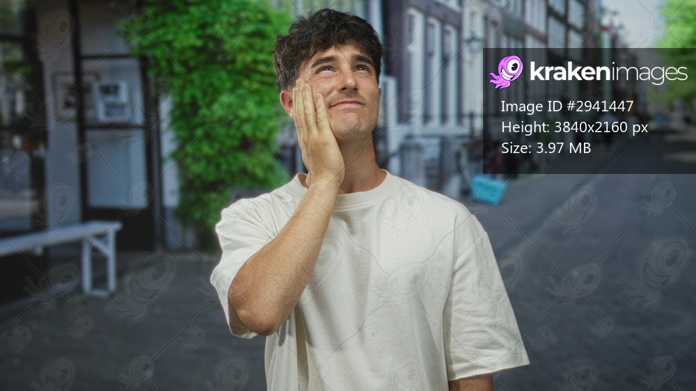 Man with hand on cheek standing on street in city wearing white t shirt, looking upward with slight smile; thoughtful contemplation.