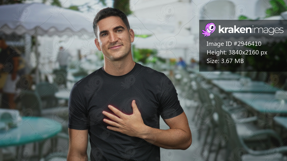 Man with hand on chest at outdoor restaurant terrace on the street, smiling to camera with calm expression; sincere gratitude.