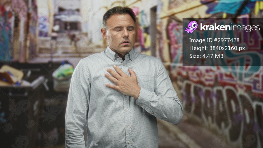 Man with hand on chest clutching chest, wincing and eyes closed, possible heartattack on a graffiti-lined street; panic urgency.