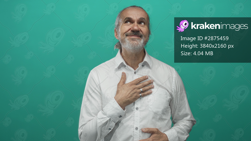 Man with hand on chest gesture in teal studio wearing white shirt and silver rings, slight smile and long gray beard, looking upward; gratitude.