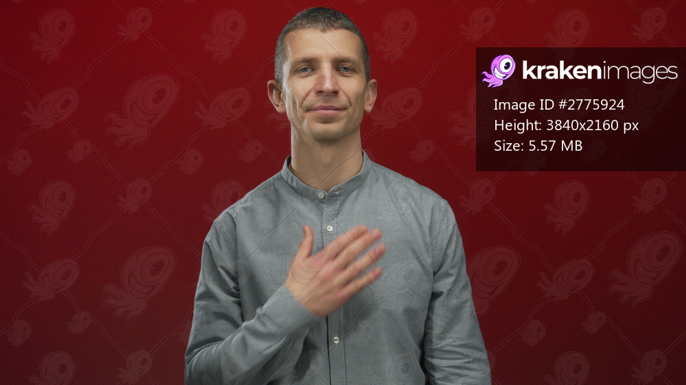 Man with hand on chest in a gray shirt against a red wall, expressing a subtle emotion with closed eyes in an isolated setting.