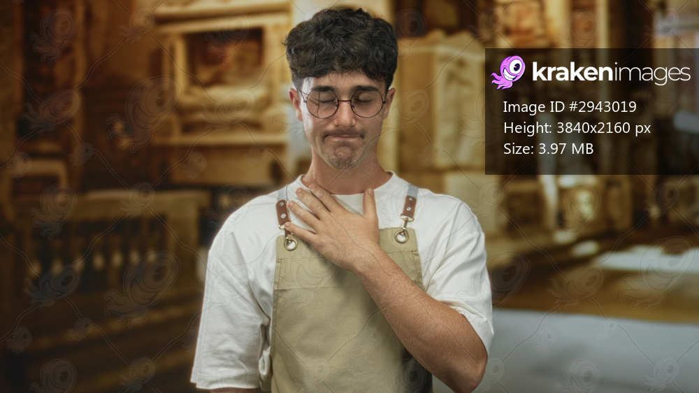 Man with hand on chest in church interior wearing apron and glasses, standing near aisle and altar; devotion faith.