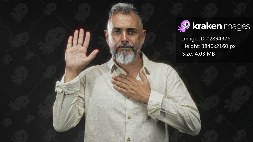 Man with hand on chest and raised palm in black studio, bearded middle age male with eyes closed in solemn pledge pose; sincerity calm.