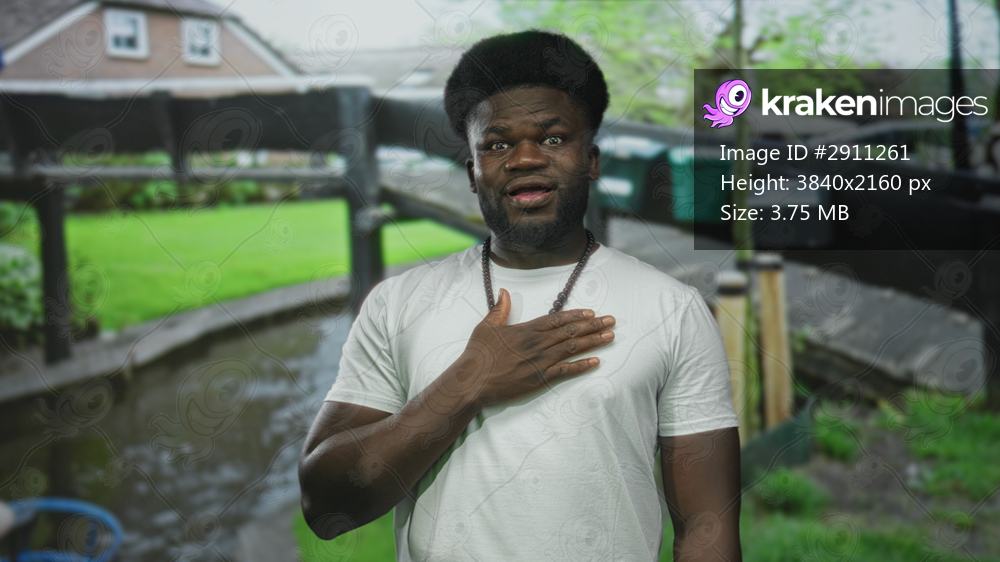 Man with hand on chest touching heart on street near canal in amsterdam; sincerity gratitude pledge.