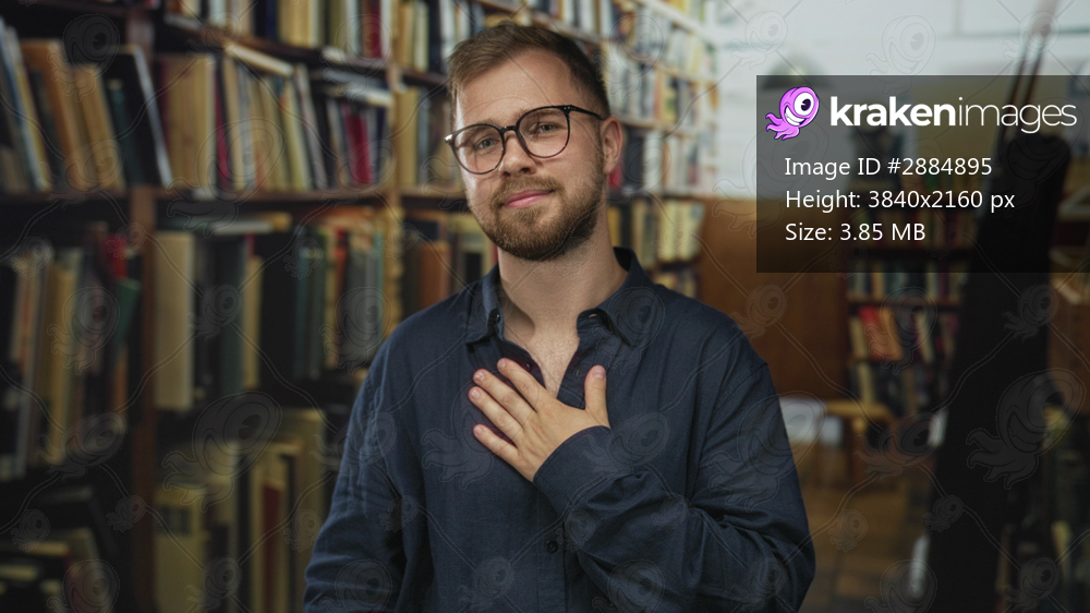 Man with hand on chest waving amid bookshelves in a building library aisle, wearing glasses and a navy shirt, smiling; gratitude warmth.