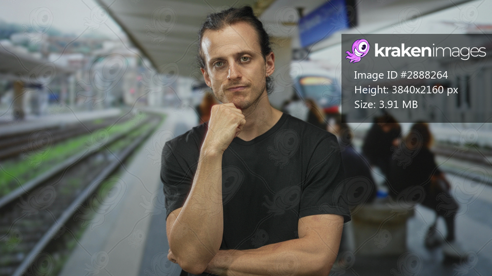 Man with hand on chin at a street platform in a train station, arms folded and looking sideways; thoughtful pause.