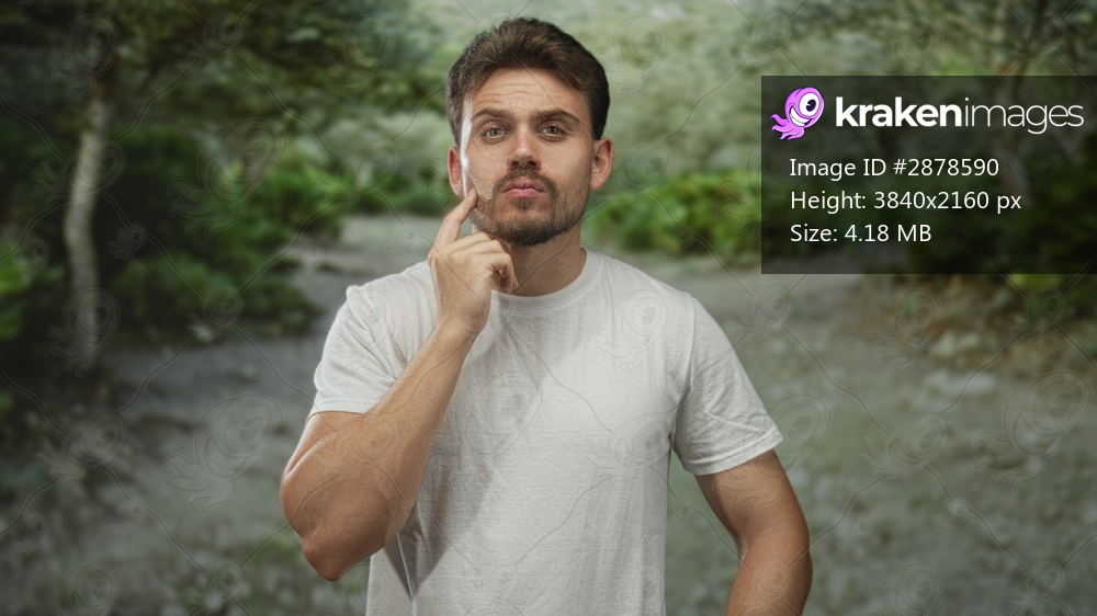 Man with hand on chin and bearded face in a forest path wearing white t shirt with rolled sleeves and exposed forearms; thinking.